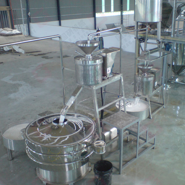 大米→射流提升→除砂→洗米、浸米→滤水→磨浆→压滤脱水→碎粉→高温搅拌→挤片→挤丝→蒸熟→老化→切断→松丝→洗粉→滤水→定量→干燥→成品